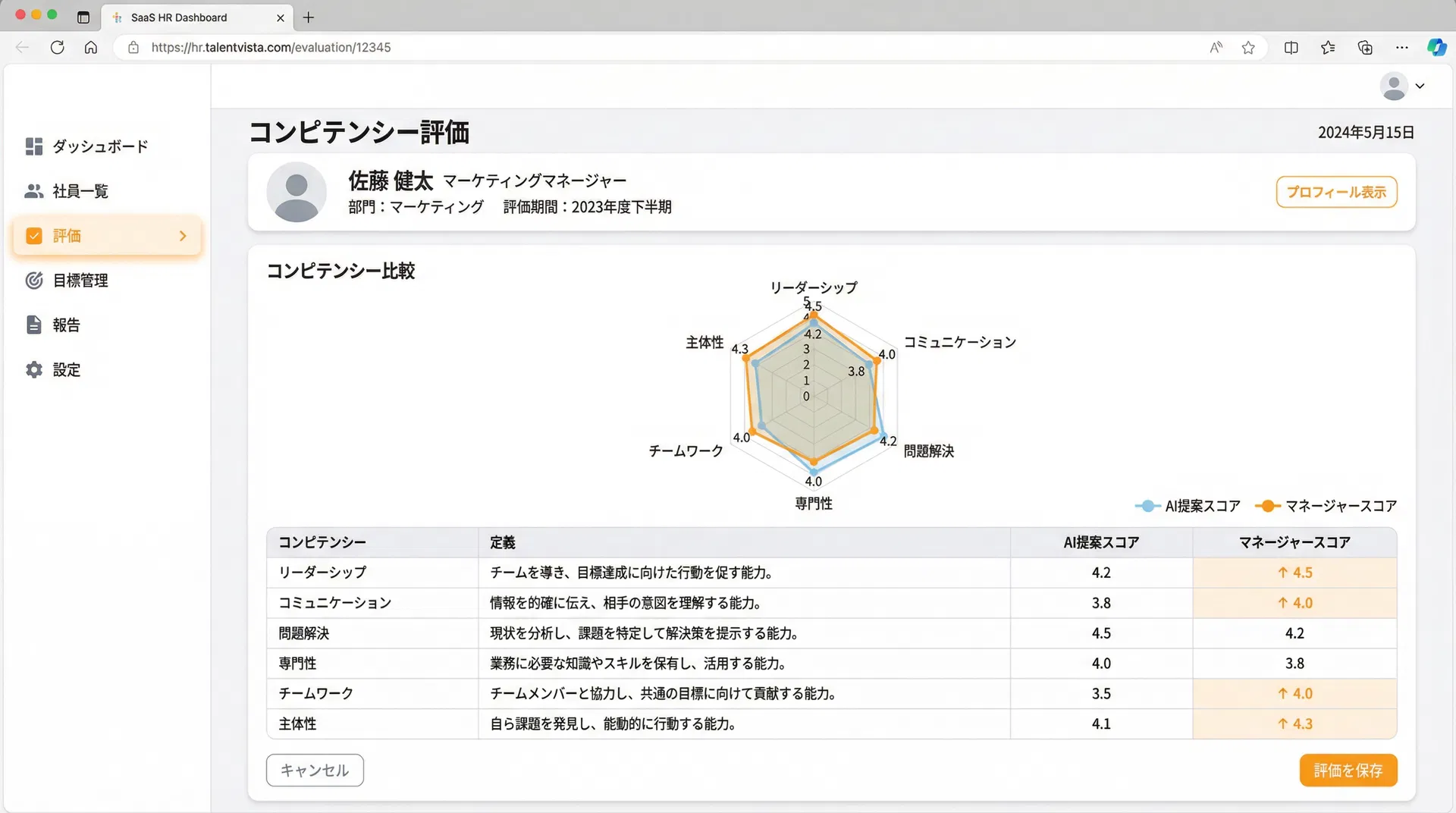 「なんとなくそう感じる」を排除。AIが具体的な行動事例を根拠として提示し、評価の言語化を支援します。