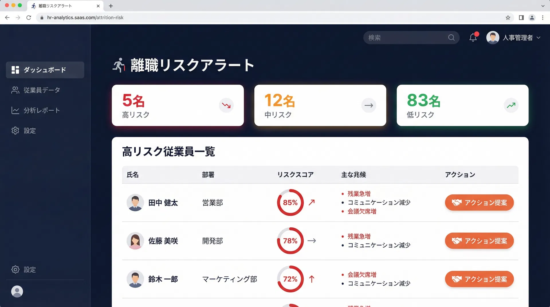 中途採用を強化しているが 定着率の低さに課題を持つHR・経営者の方へ離職シグナルをAIが早期に検知し、マネージャーへアクションを提案。退職届の前に、打ち手が打てます。